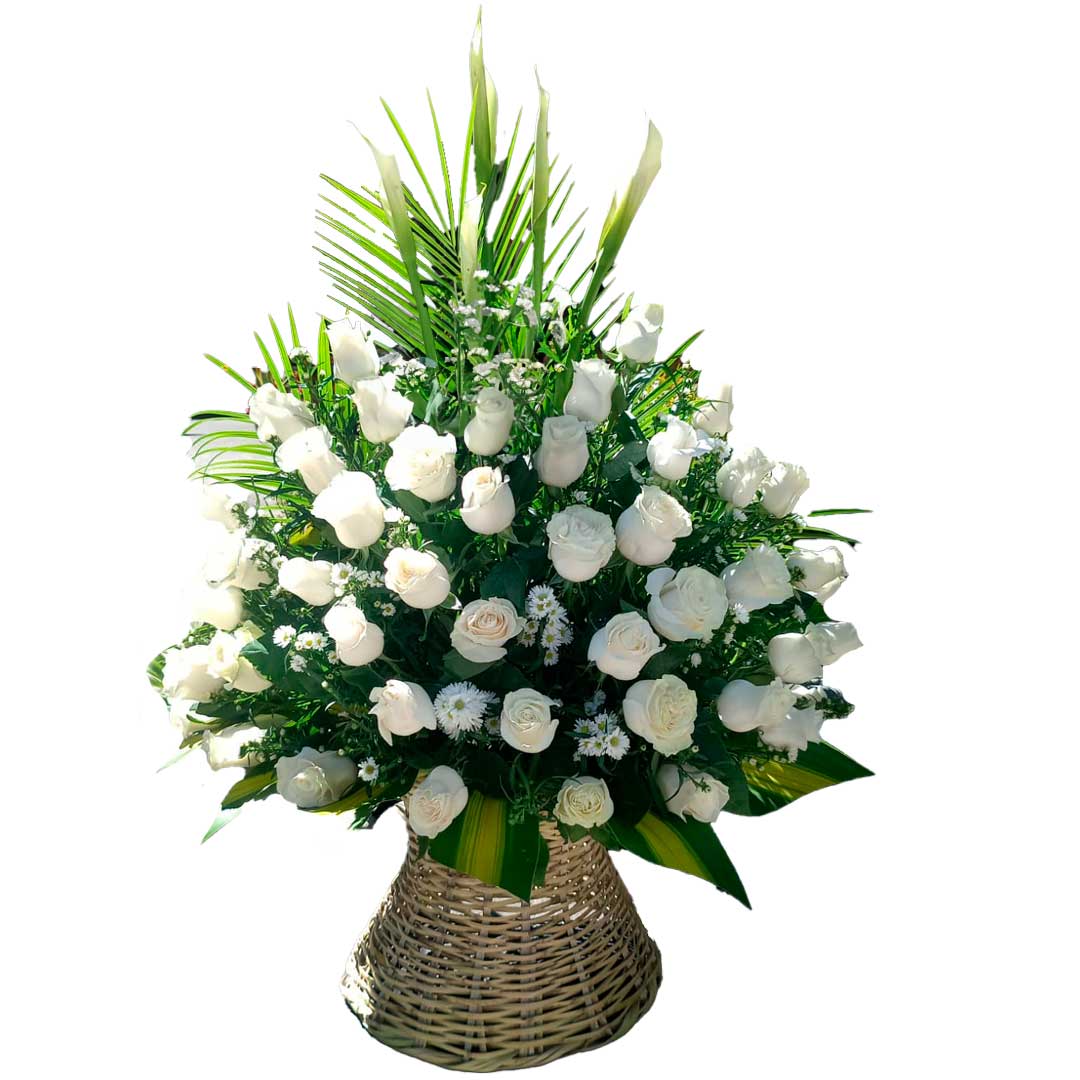 Majestuoso arreglo floral de cien rosas en una base blanca con una lazo decorativo.