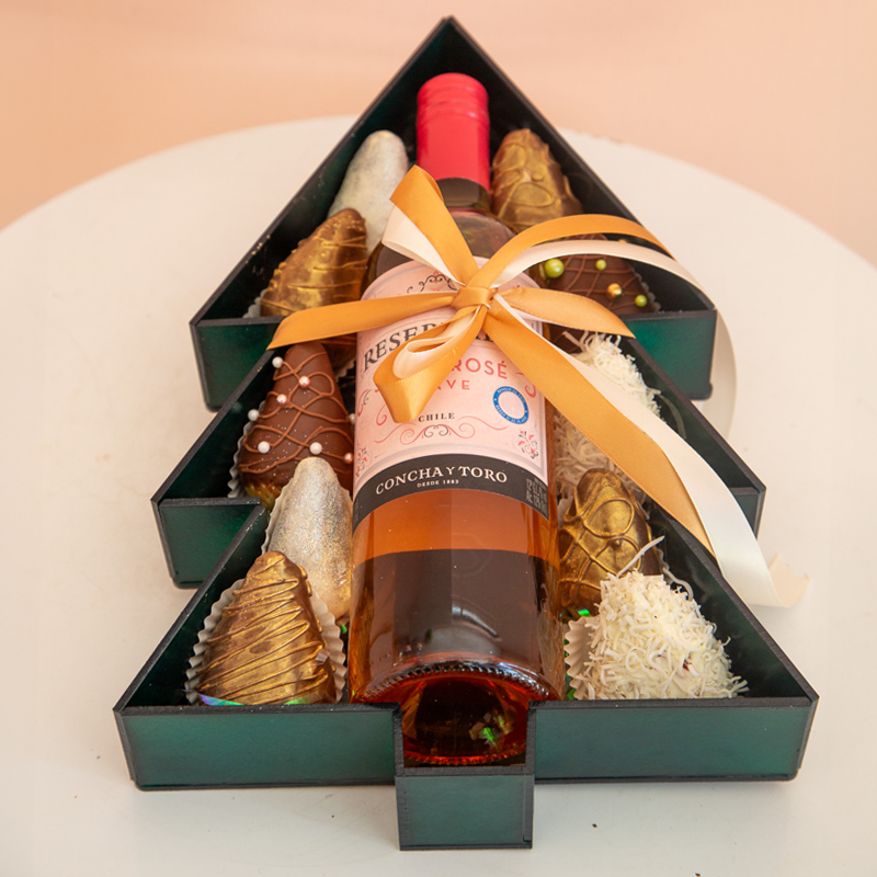 Regalo navideño en forma de árbol que contiene fresas achocolatadas y vino