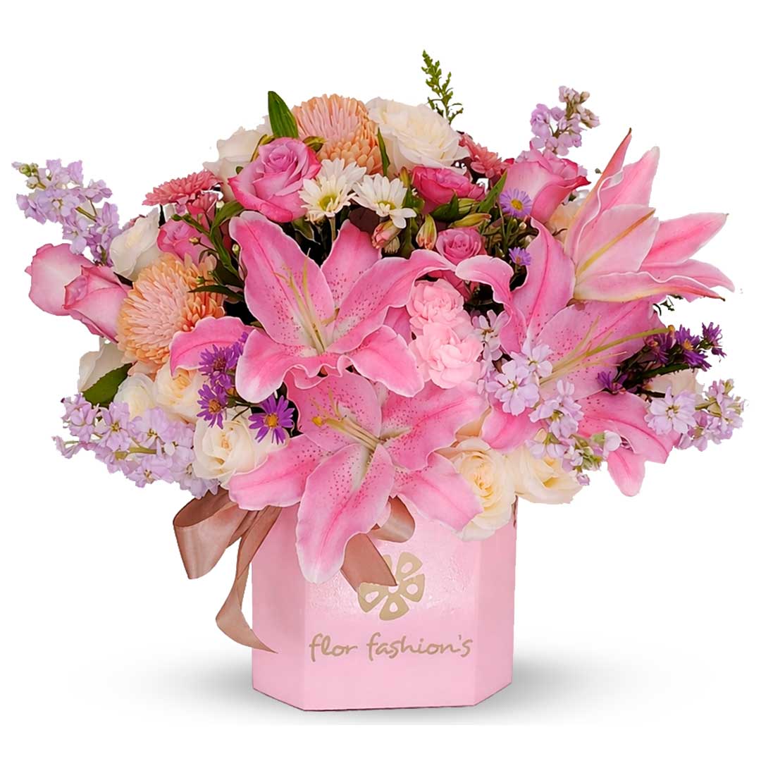 Hermoso arreglo floral con lirios rosados, en base de m