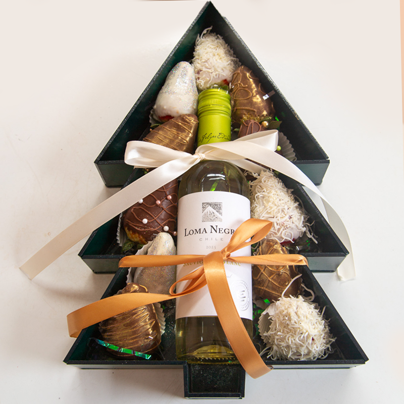 Regalo navideño en forma de árbol que contiene fresas achocolatadas y vino